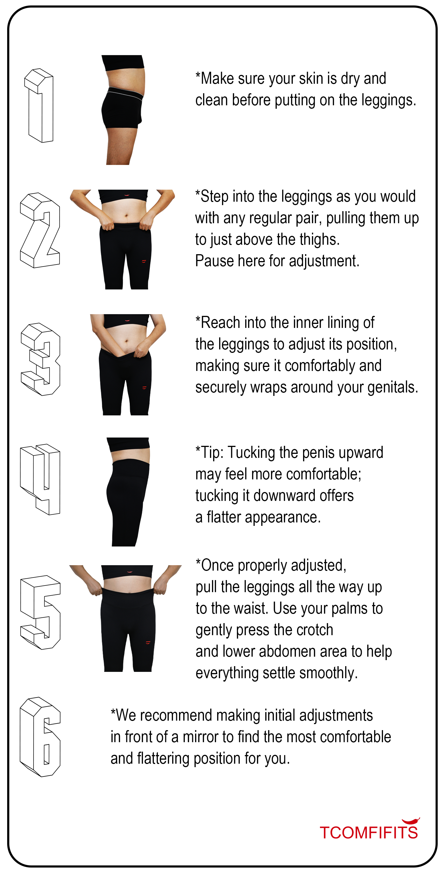 Unlike standalone tucking underwear, the outer leggings fabric applies gentle yet firm compression, helping to smooth and minimize any unwanted prominence. The result is a naturally flatter, more seamless front profile—supporting you as you present yourself on your own terms. Without the need for additional garments.