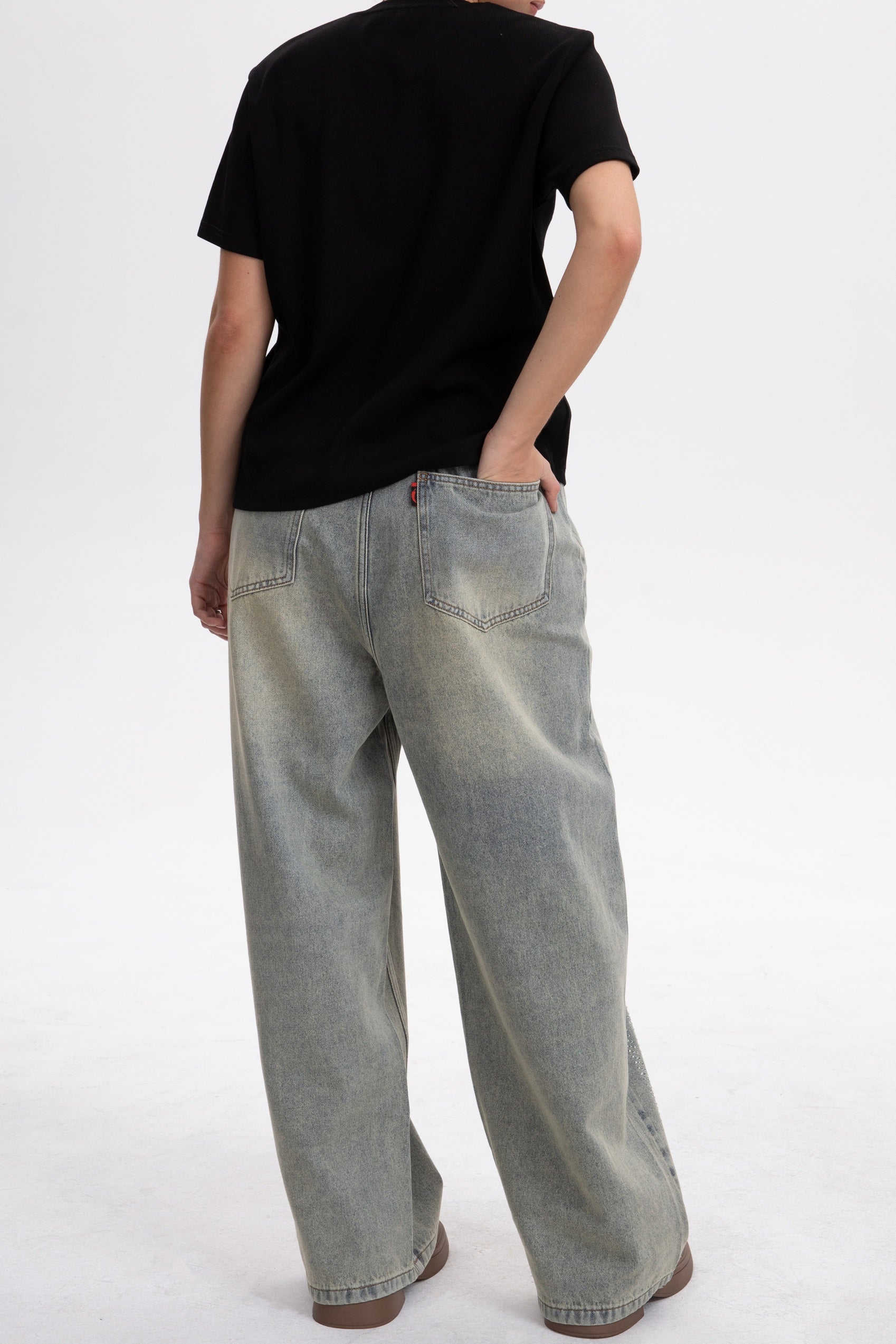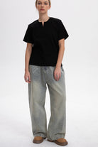 Crafted from high-density, thick denim that holds its wide-leg shape. The added weight ensures the fabric falls in a clean, vertical line, effectively masking feminine curves and enhancing a straight-leg look.