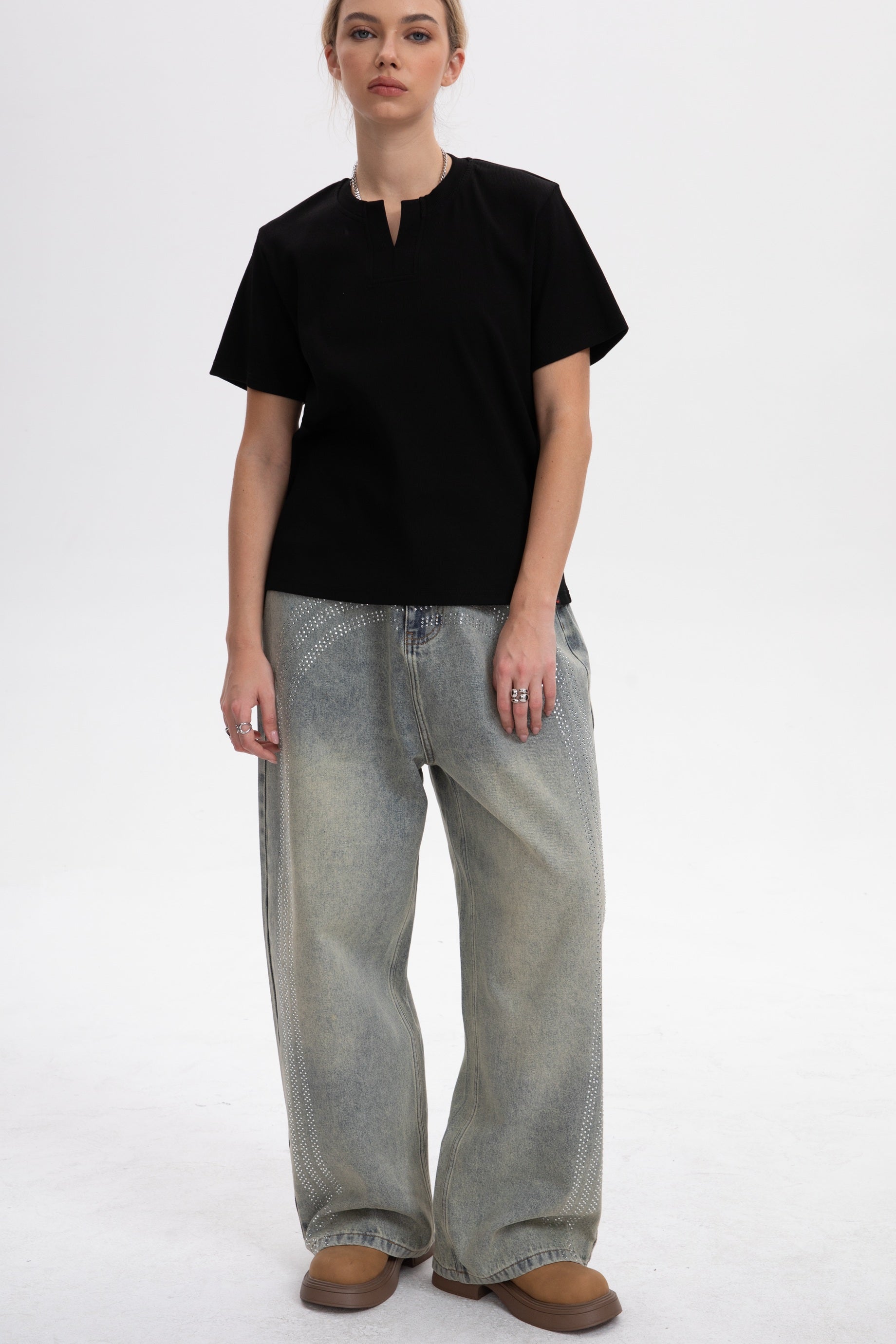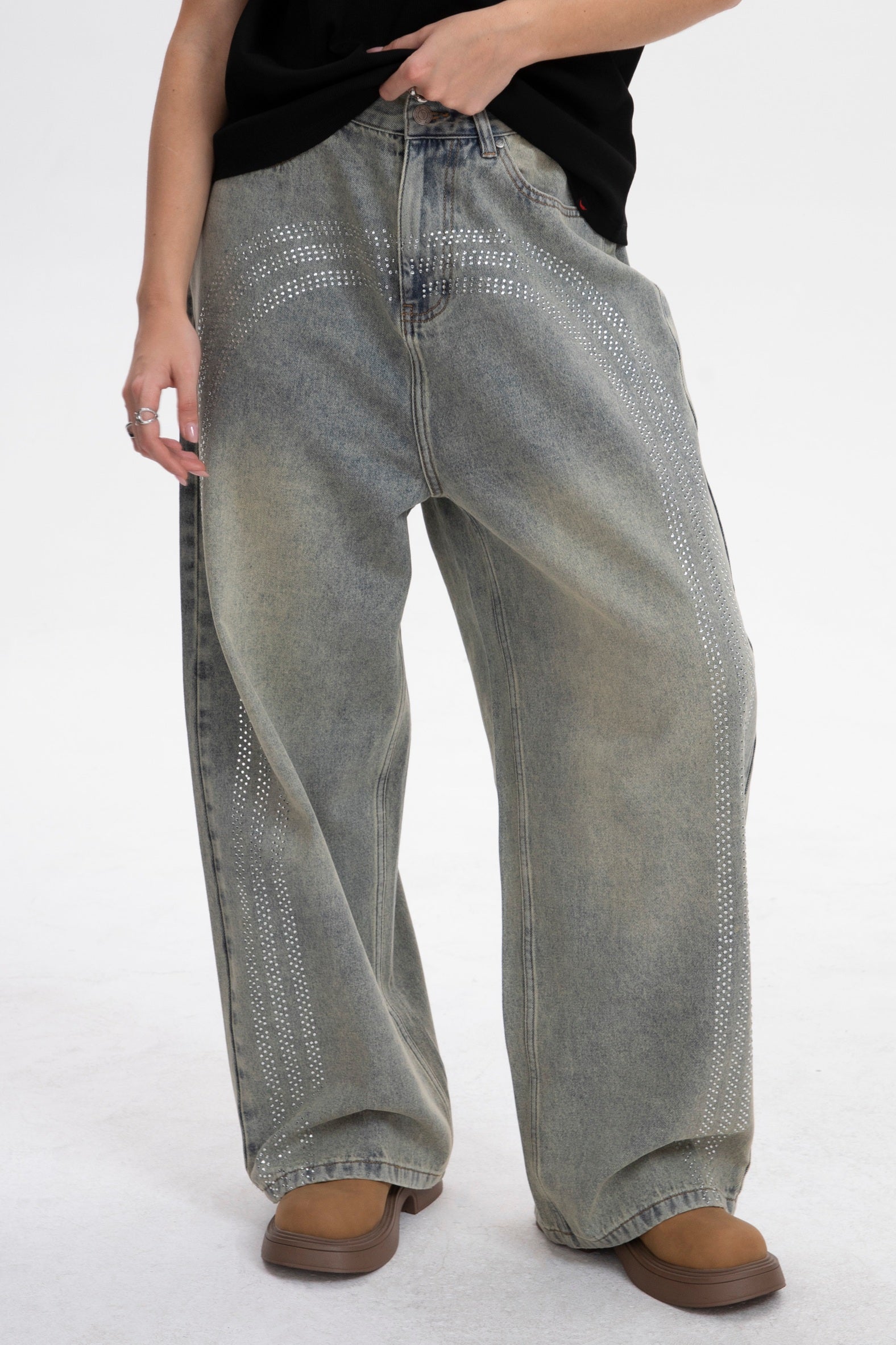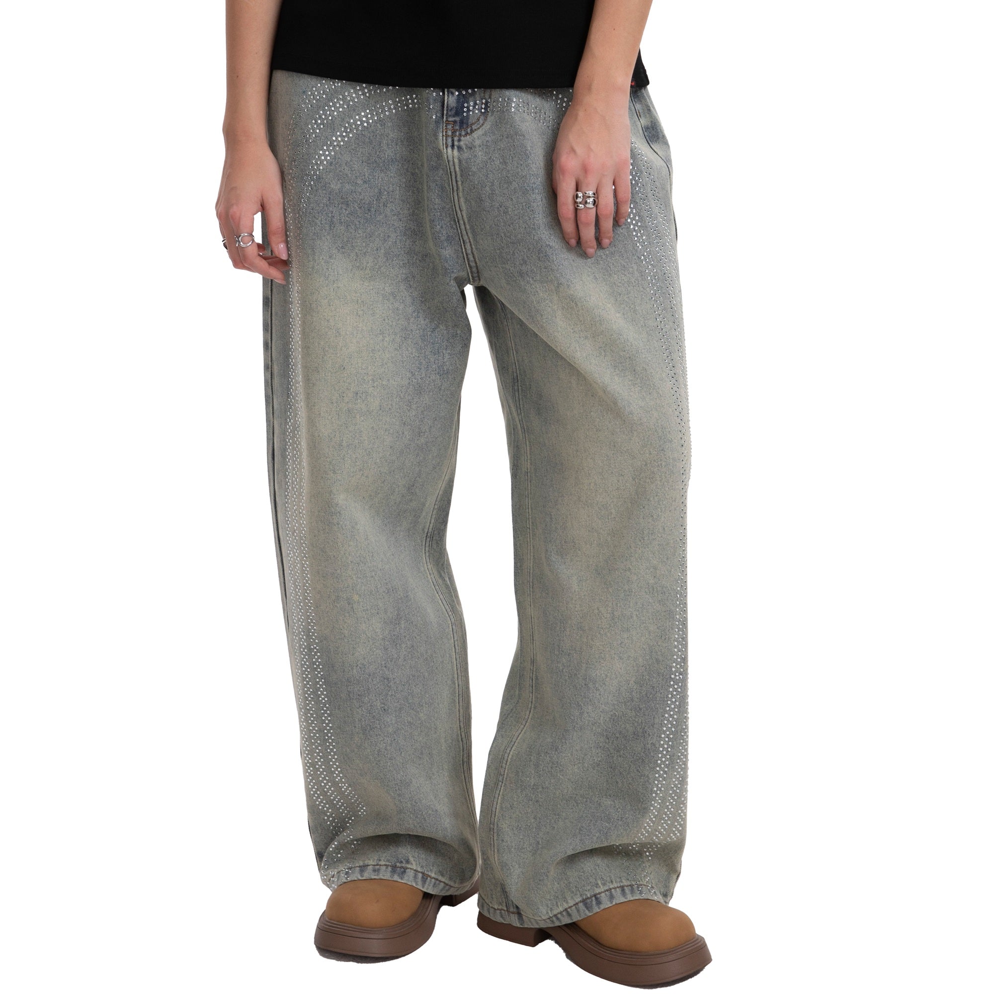 Featuring a vintage light blue wash and iconic double-row rhinestone side stripes. This design blends early 2000s street style with a bold, gender-neutral edge.