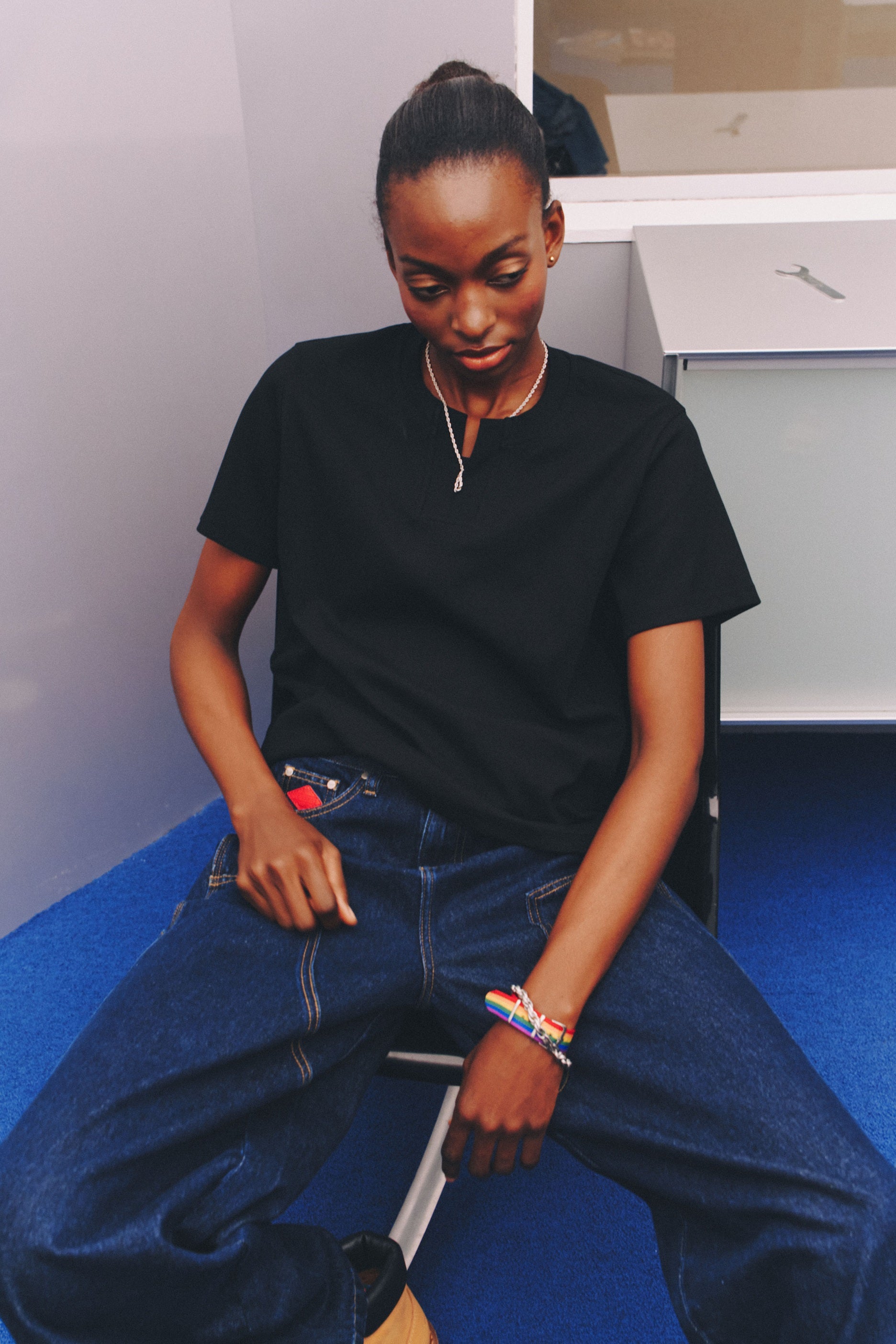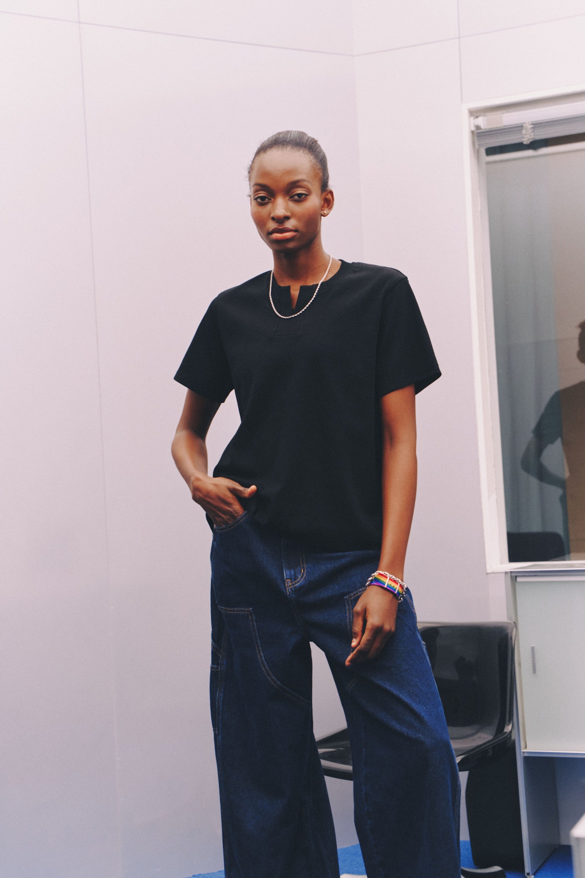 Engineered specifically to neutralize the AFAB figure. The straight, wide-leg cut and rigid fabric work together to hide hip and thigh curves, creating a bold, linear masculine frame.
